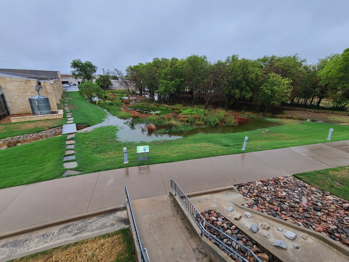 The wetland’s reconfigured micro-pools blend peacefully into an even larger natural Rainscapes solution that spans seven acres across the TRWD campus, featuring a variety of native and adapted plants, trees, meandering rock channels, and a raingarden that collects stormwater, slowly infiltrating back into the soil. The raingarden’s function is to replenish shallow groundwater storage for later use by nearby plants in dryer, hotter months.