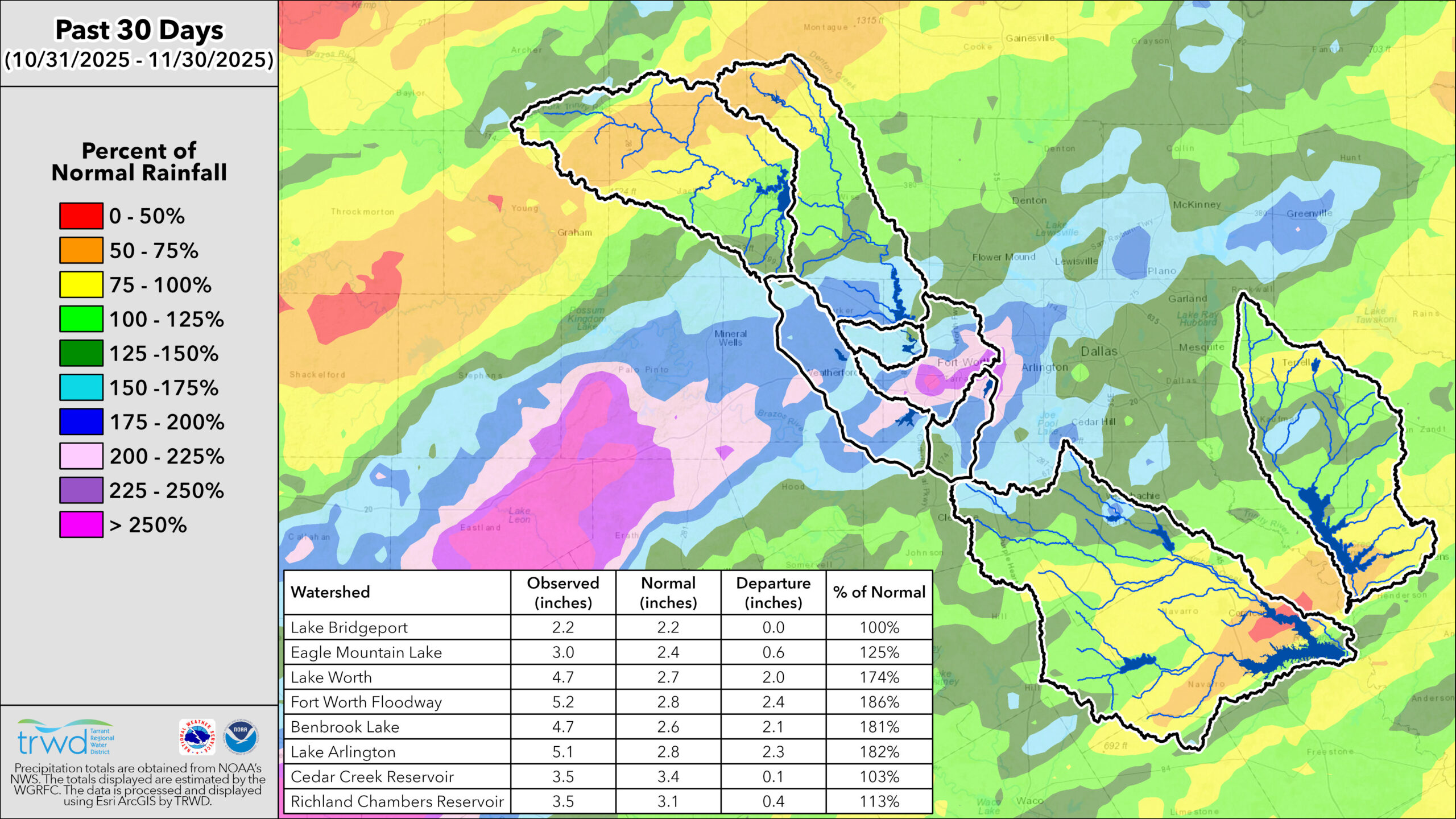 - Rainfall: TRWD reservoirs received 2 to 5 inches of rain in November, mostly toward the end of the month, which is above the monthly average. (See the 30-Day Percent of Normal Rainfall map below.)
