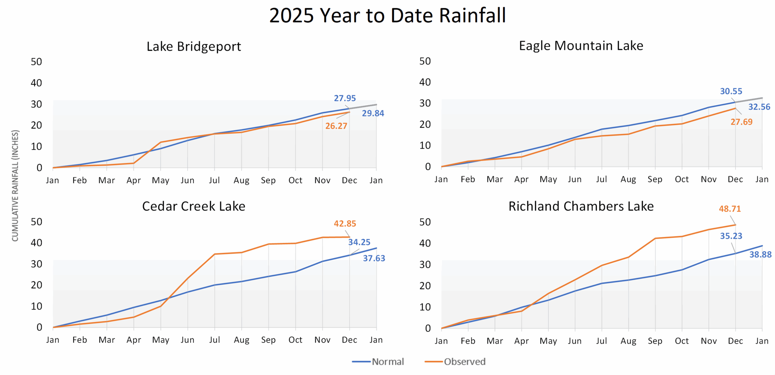 November started off drier than usual across North Texas, but the story changed toward the end of the month. A series of rain events delivered 2 to 5 inches of precipitation, pushing conditions from below-normal to above-normal rainfall overall. Temperatures were also noteworthy—November averaged about 6.5°F warmer than normal, making it one of the warmer Novembers in recent years. Thanks to the late-month rainfall, lake levels saw a modest boost, especially in the West Fork reservoirs (Eagle Mountain and Bridgeport). This helped keep system storage near 90%, a healthy level for this time of year.
