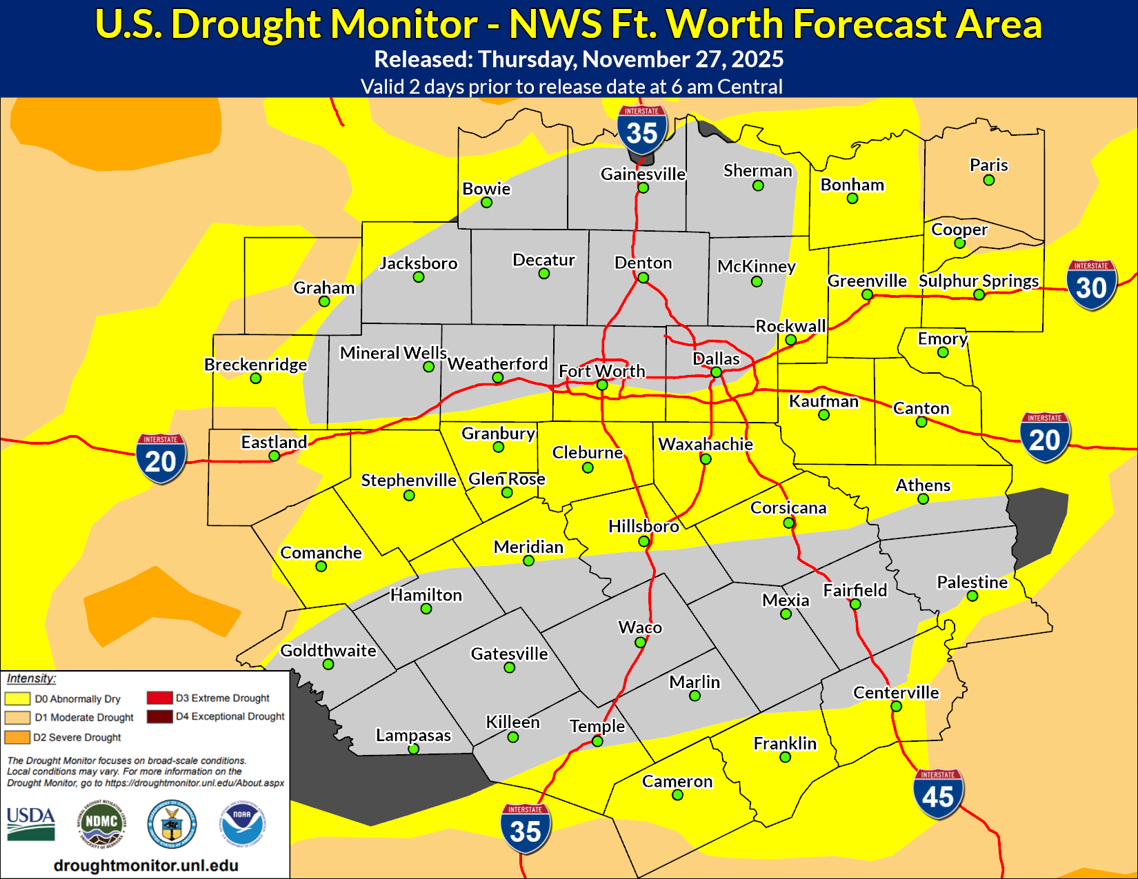 - Drought Conditions: With the recent rain, parts of North Texas are now free of drought, but most of the region is currently in the D0 Abnormally Dry category, as shown in the latest NWS Drought Monitor .