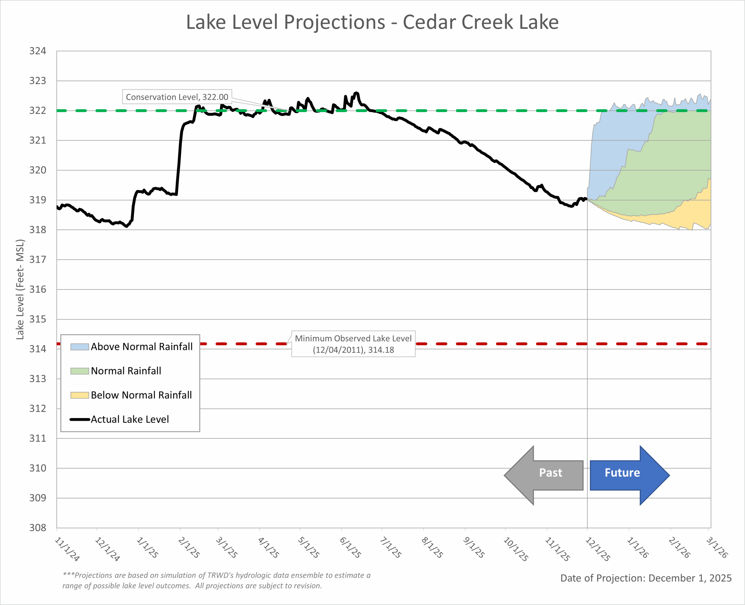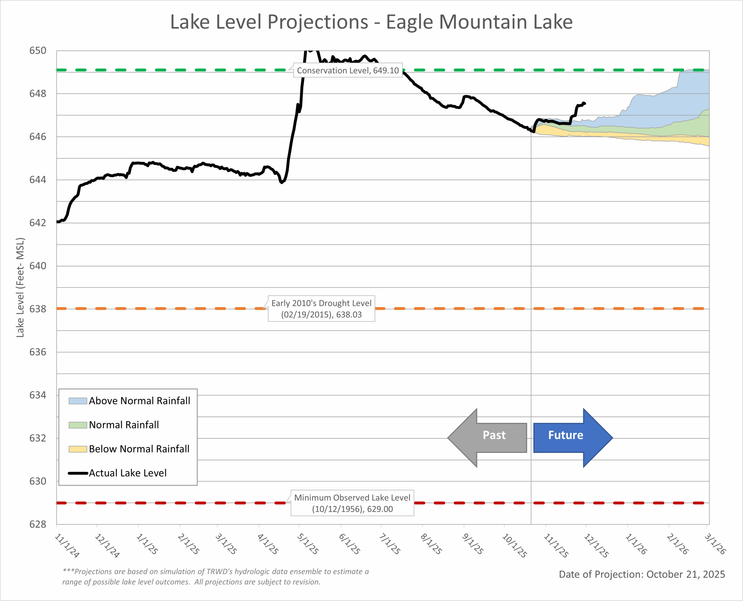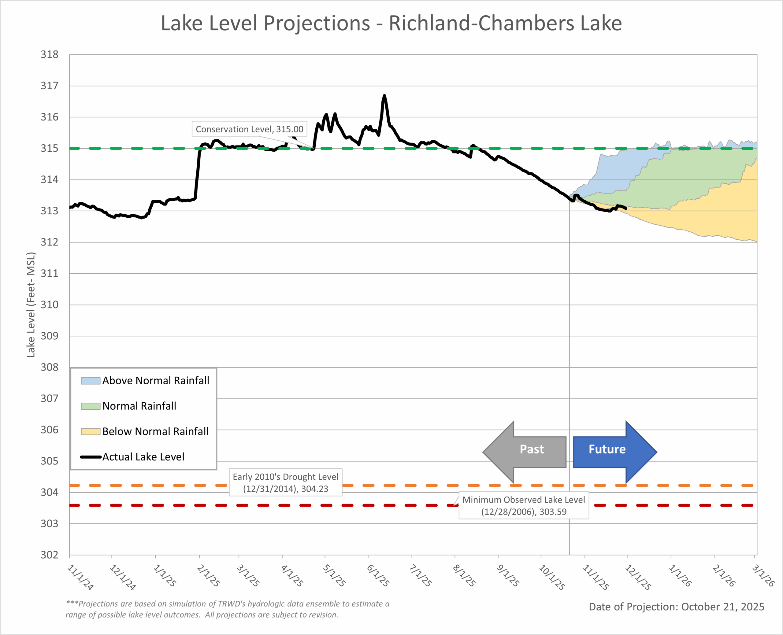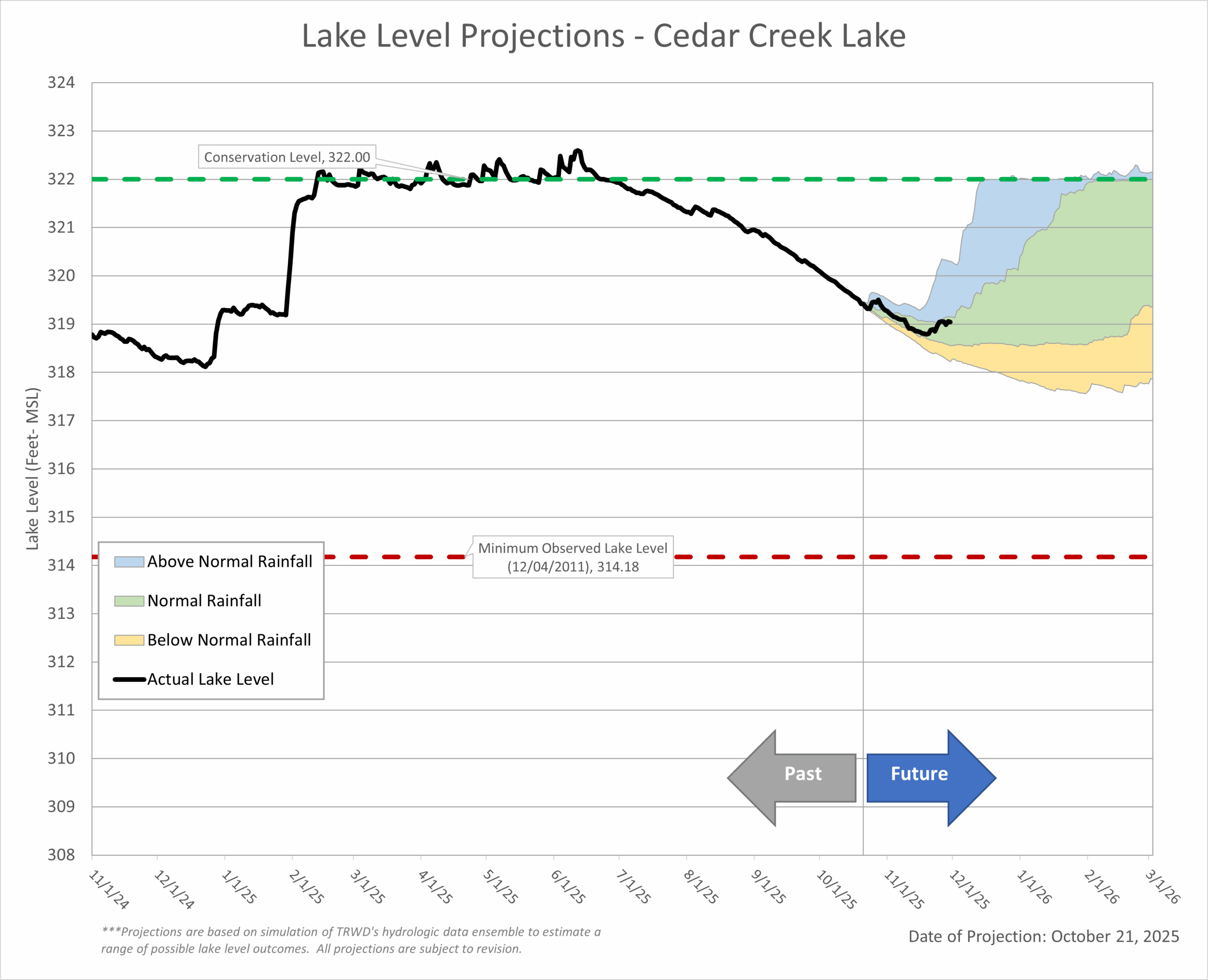 As we move into the coming weeks, conditions are expected to stay on the dry side, so lake levels will likely dip a bit. The good news? Cooler weather means less water demand and slower evaporation. Plus, with vegetation going dormant, the ground won’t soak up as much moisture—so any rain we do get has a better shot at turning into runoff. Bottom line: lake levels will decline, but the drop should be gradual.