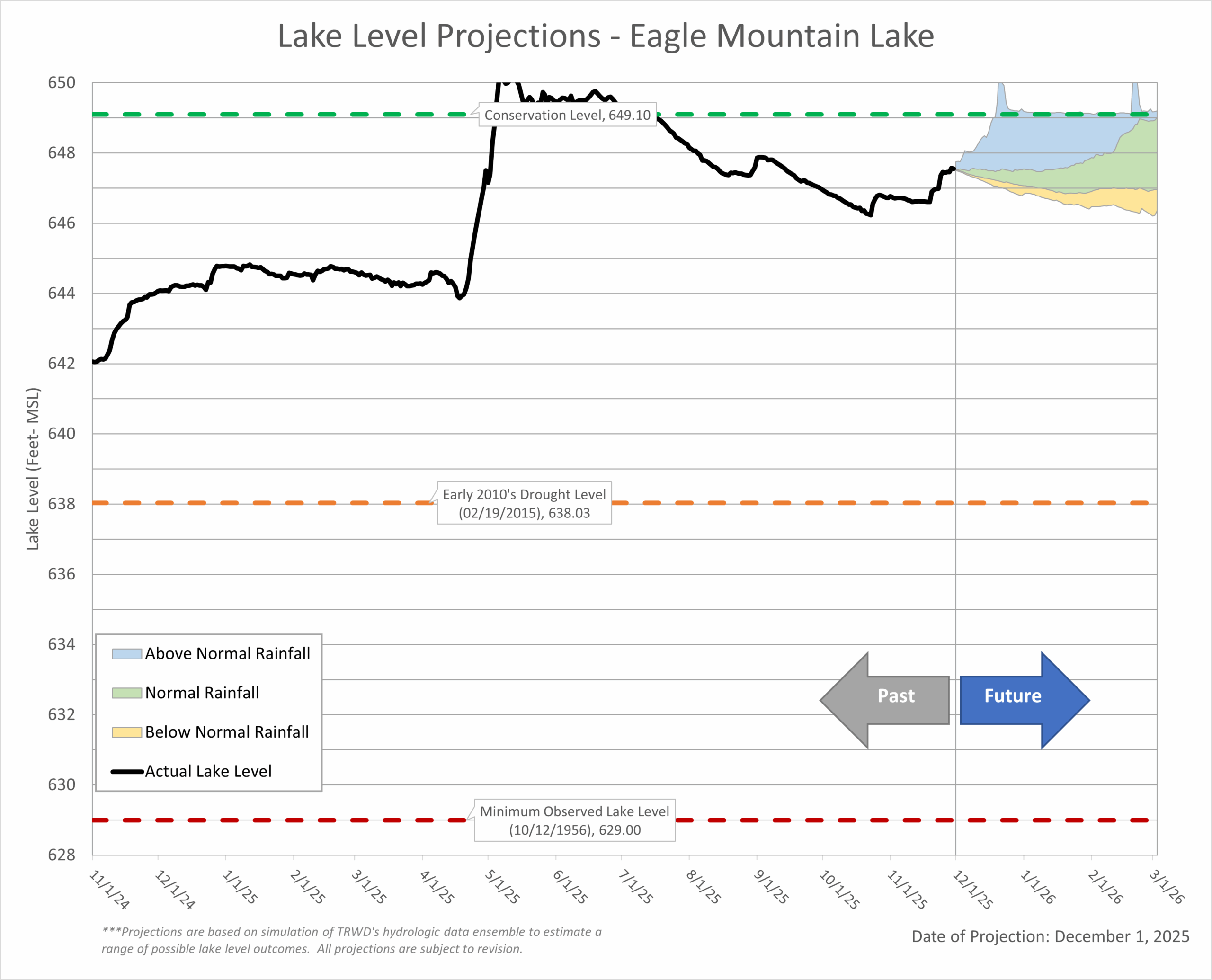 November started off drier than usual across North Texas, but the story changed toward the end of the month. A series of rain events delivered 2 to 5 inches of precipitation, pushing conditions from below-normal to above-normal rainfall overall. Temperatures were also noteworthy—November averaged about 6.5°F warmer than normal, making it one of the warmer Novembers in recent years. Thanks to the late-month rainfall, lake levels saw a modest boost, especially in the West Fork reservoirs (Eagle Mountain and Bridgeport). This helped keep system storage near 90%, a healthy level for this time of year.