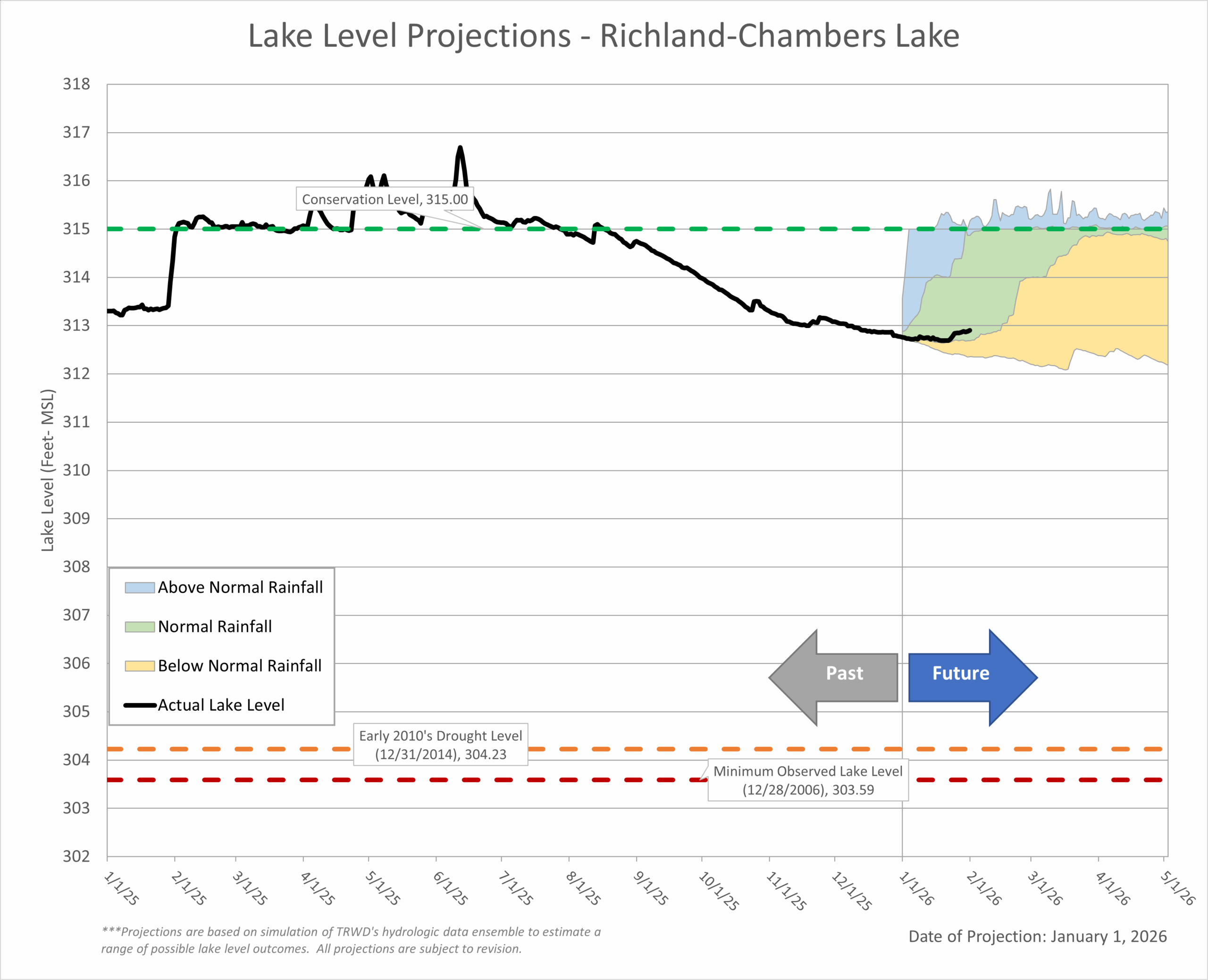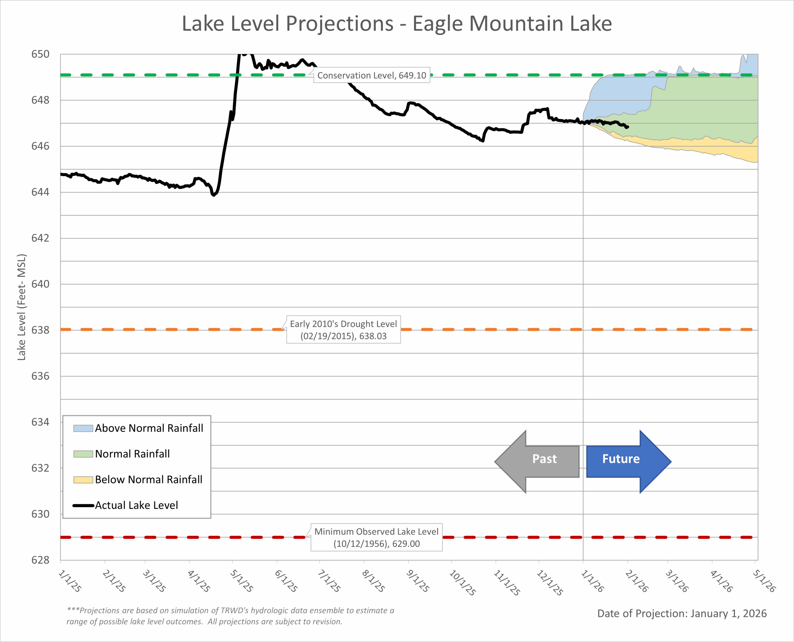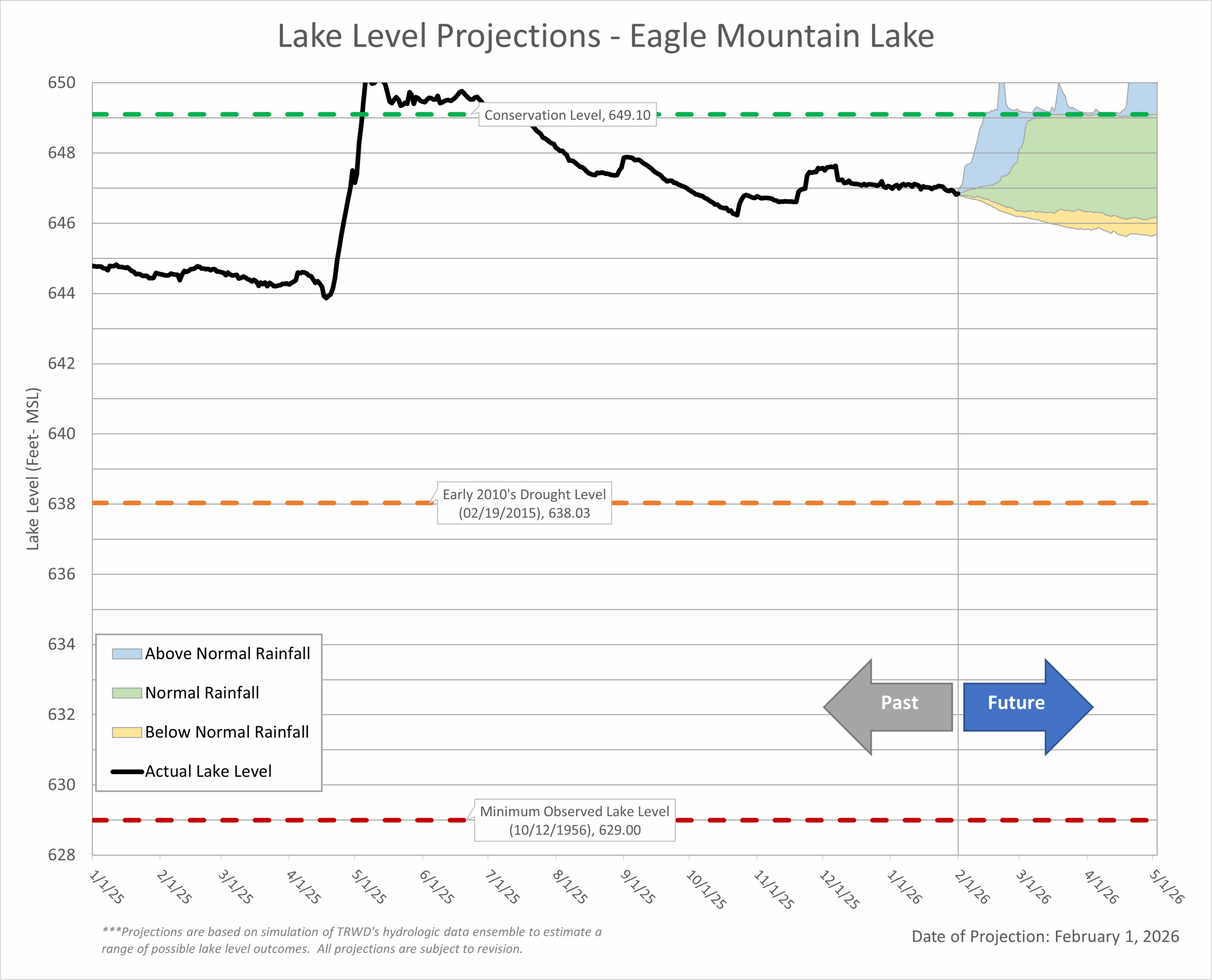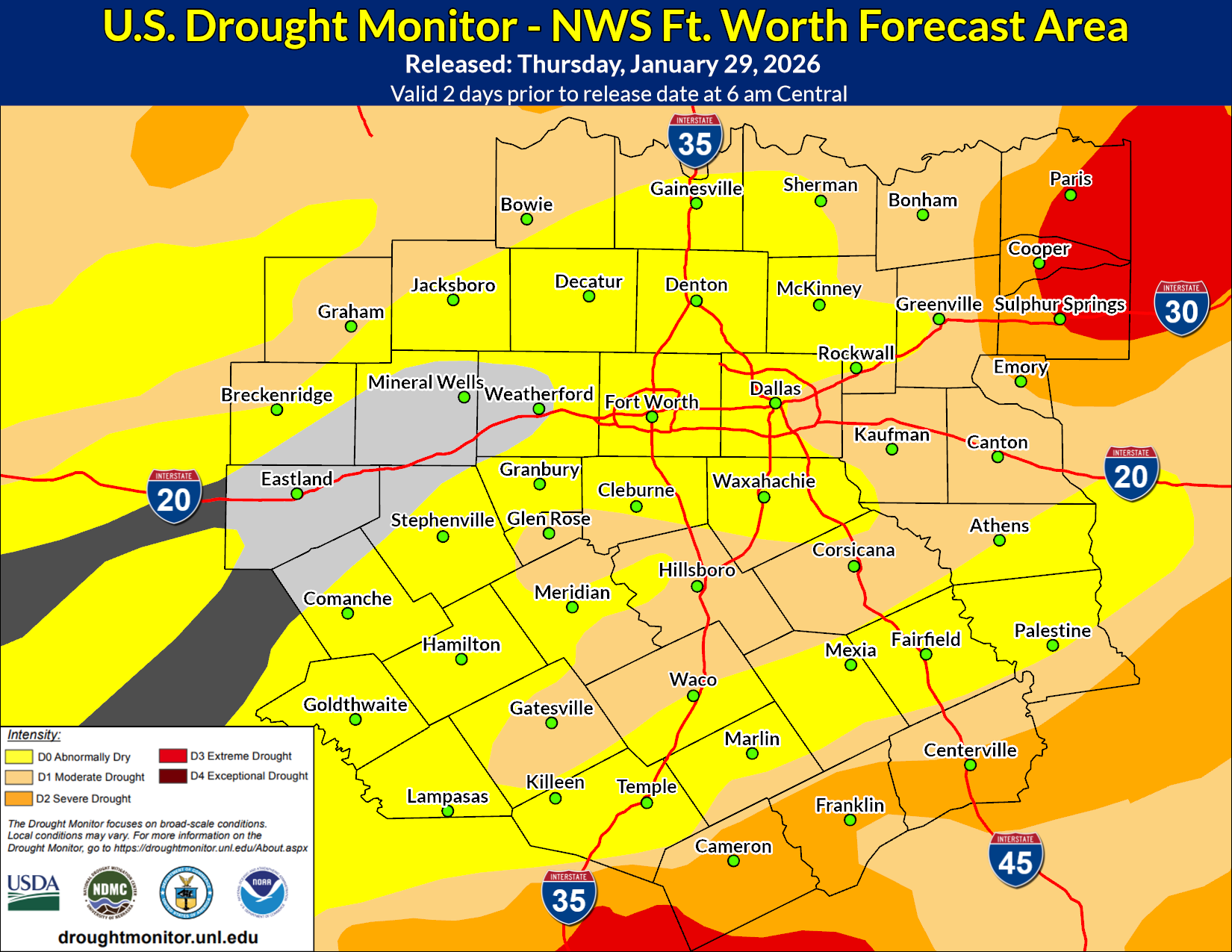 • Drought Conditions: Due to limited rain across the region, most of the TRWD service area has now moved to the D0 (Abnormally Dry) and D1 (Moderate Drought) categories, as shown in the latest NWS Drought Monitor.