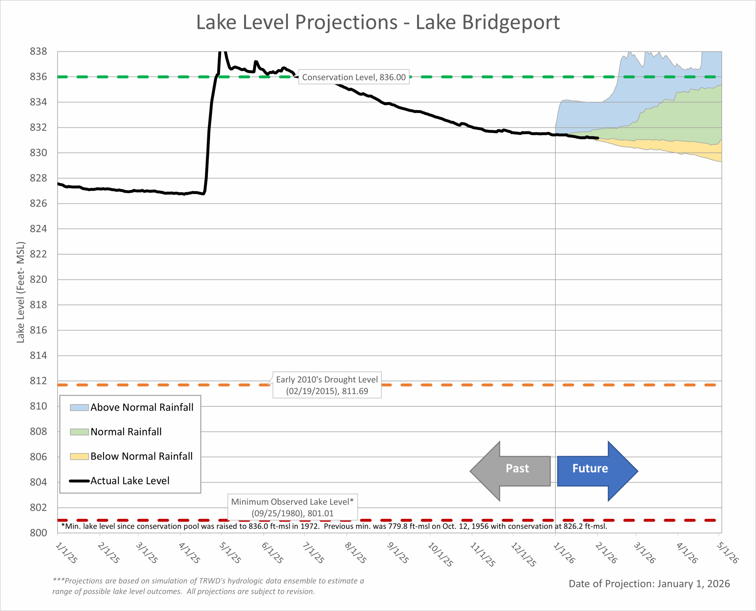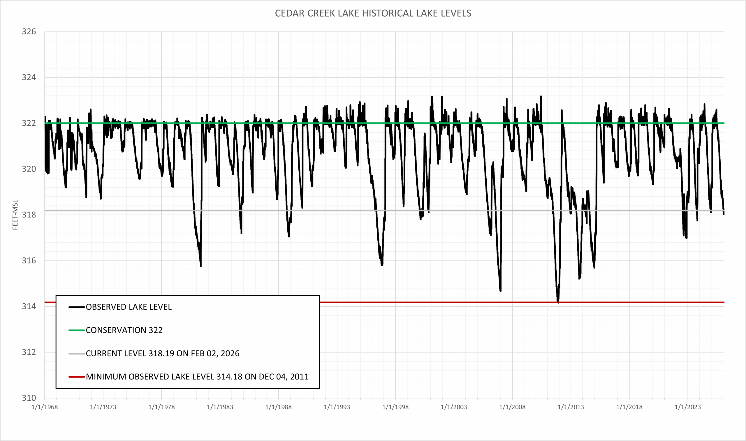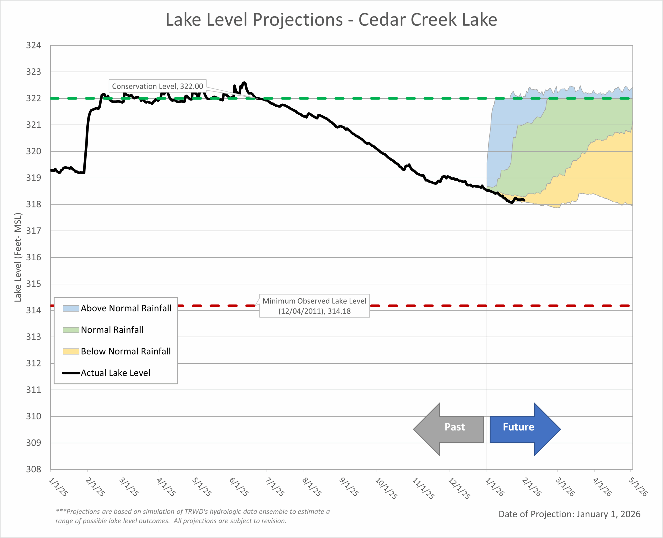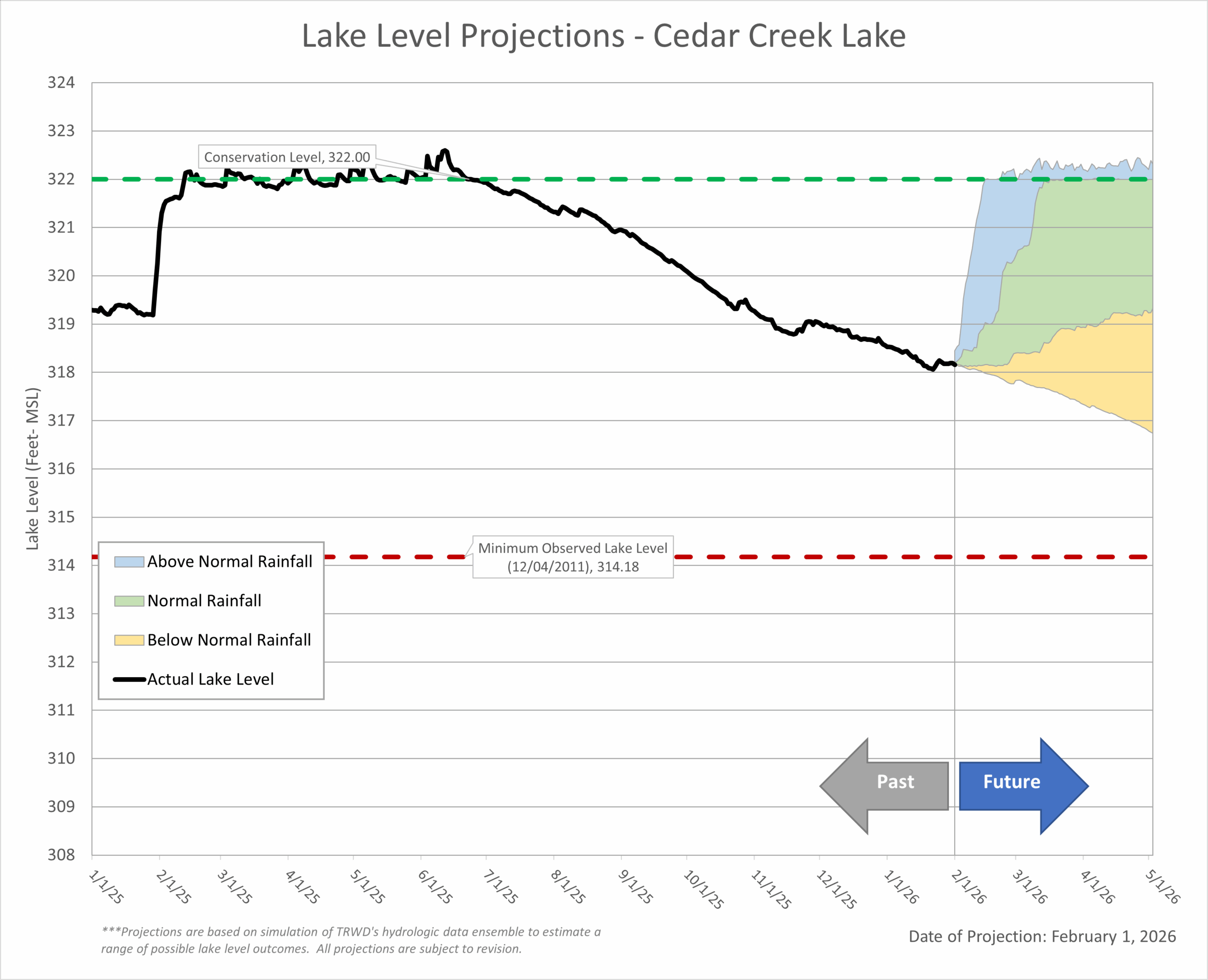 *Conservation Level: The permitted level of water an entity is allowed to hold in a lake. Any amount above the conservation level is used for the temporary storage of flood waters and must be released downstream.