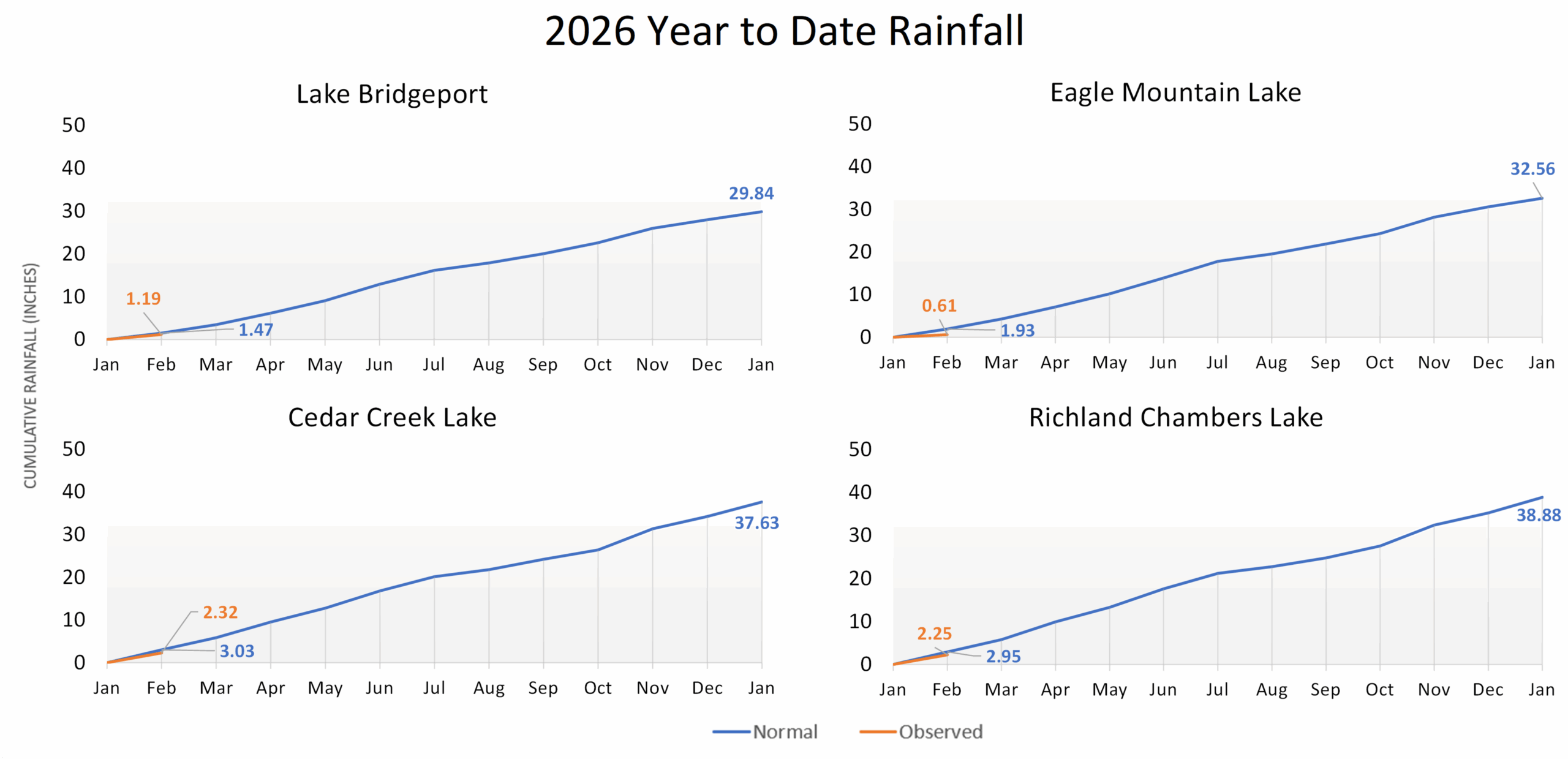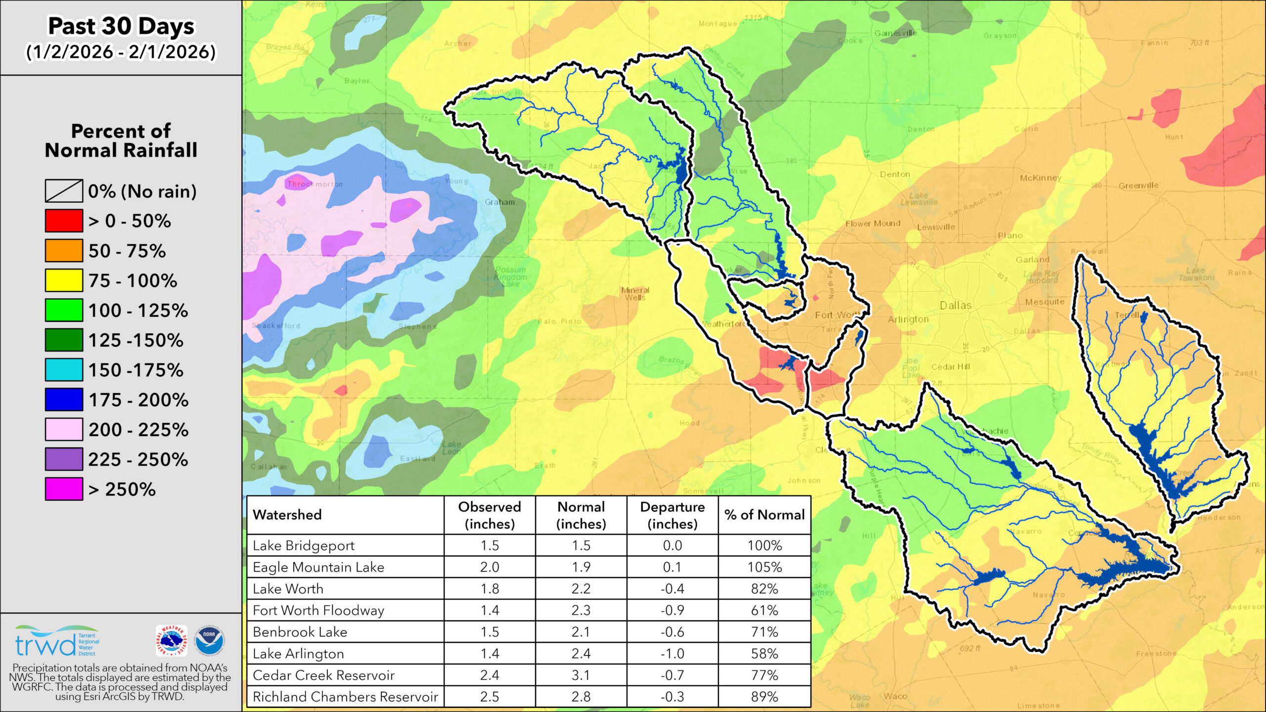 January continued the pattern we saw in December, beginning warm and dry across the TRWD service watersheds. The arrival of the winter storm dropped temperatures drastically, which kept the monthly average near normal level. Precipitation totaled 0.93 inches at DFW airport below the normal (2.53 inches). Despite another month of below-average precipitation, TRWD’s system storage has held steady over the past 30 days, and is currently around 88%, a healthy level for this time of year.