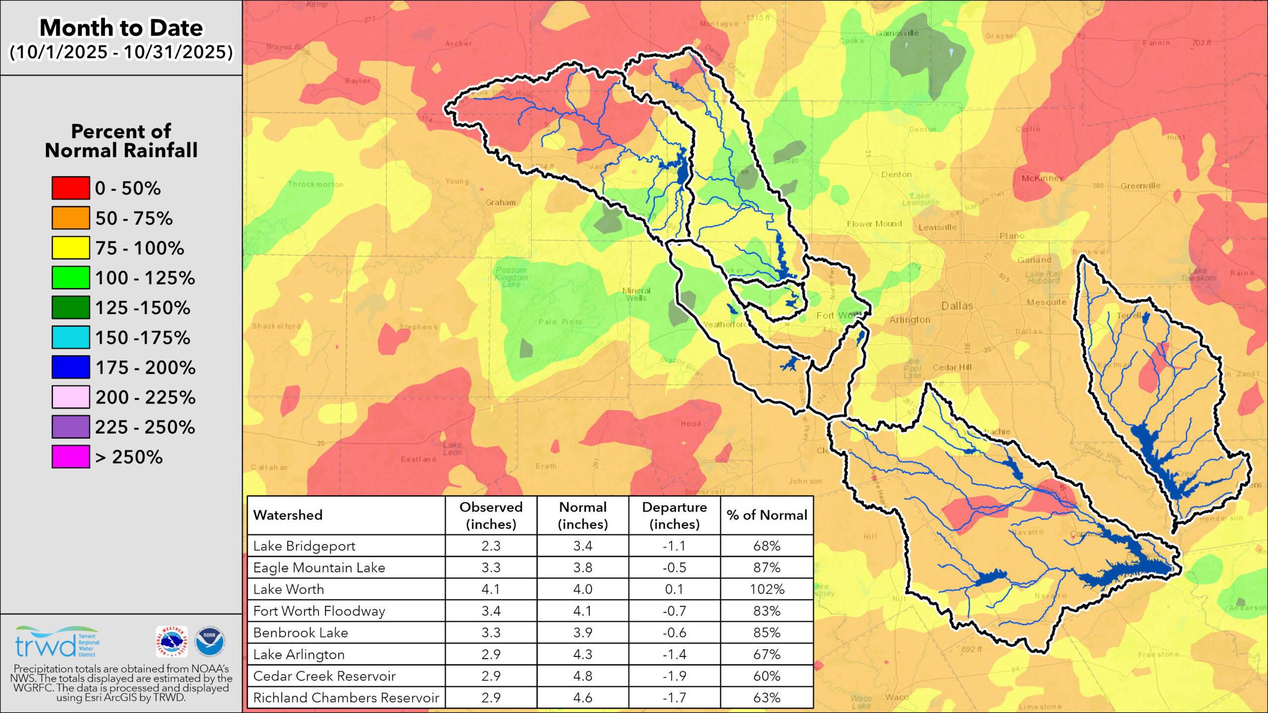 - Rainfall: TRWD reservoirs received 2 to 3 inches of rain during October, which is below the monthly average. (See the 30-Day Percent of Normal Rainfall map below.)