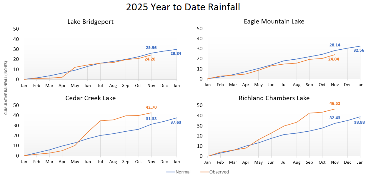 October was mostly warm and dry across the TRWD system, with only a few wet days late in the month. Although lake levels have gradually declined, total storage remains healthy at 90%, thanks to a wet spring and a mild August. The last time we saw 90% storage on November 1 was in 2021. Looking ahead, lake levels will likely decline this fall as dry conditions persist. The good news: the cooler months bring lower water demand and reduced evaporation, slowing the rate of decline. Plus, dormant vegetation means less soil absorption, so any rain we receive is more likely to turn into runoff.