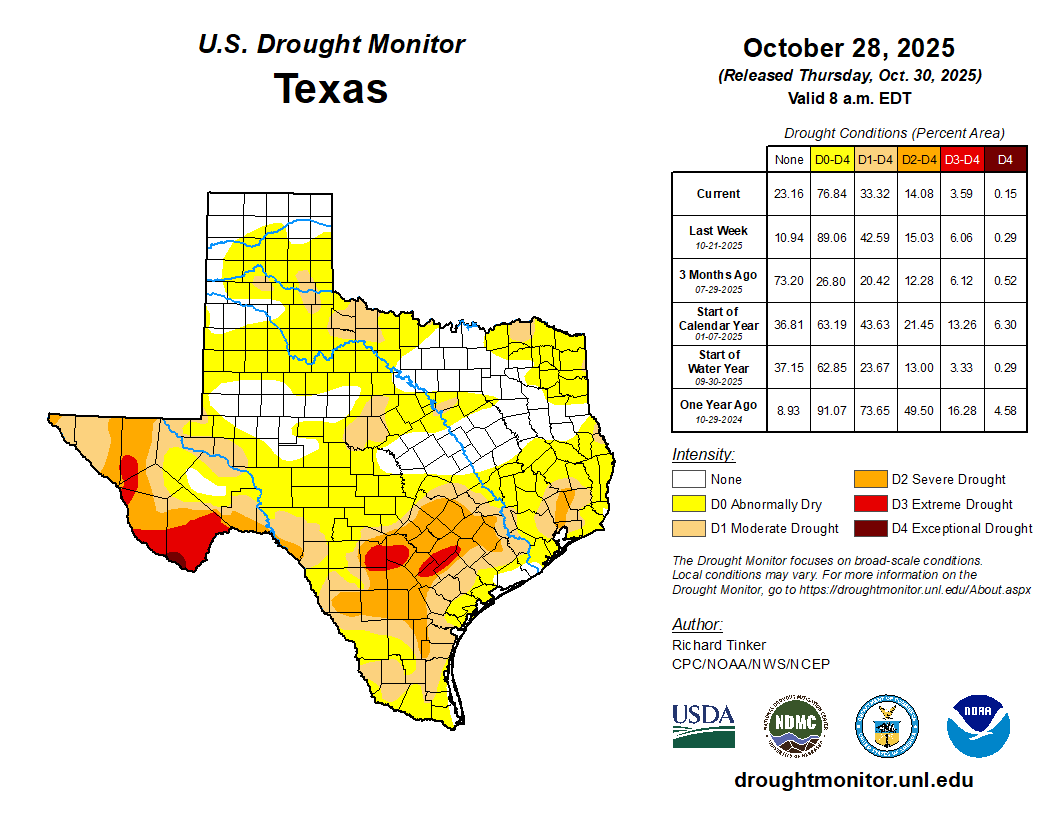- Drought Conditions: Drought severity increased through most of October, but late-month rainfall eased drought severity slightly, bringing conditions closer to early-October levels. The latest NWS Drought Monitor reflects this improvement, though dry conditions remain a concern.
