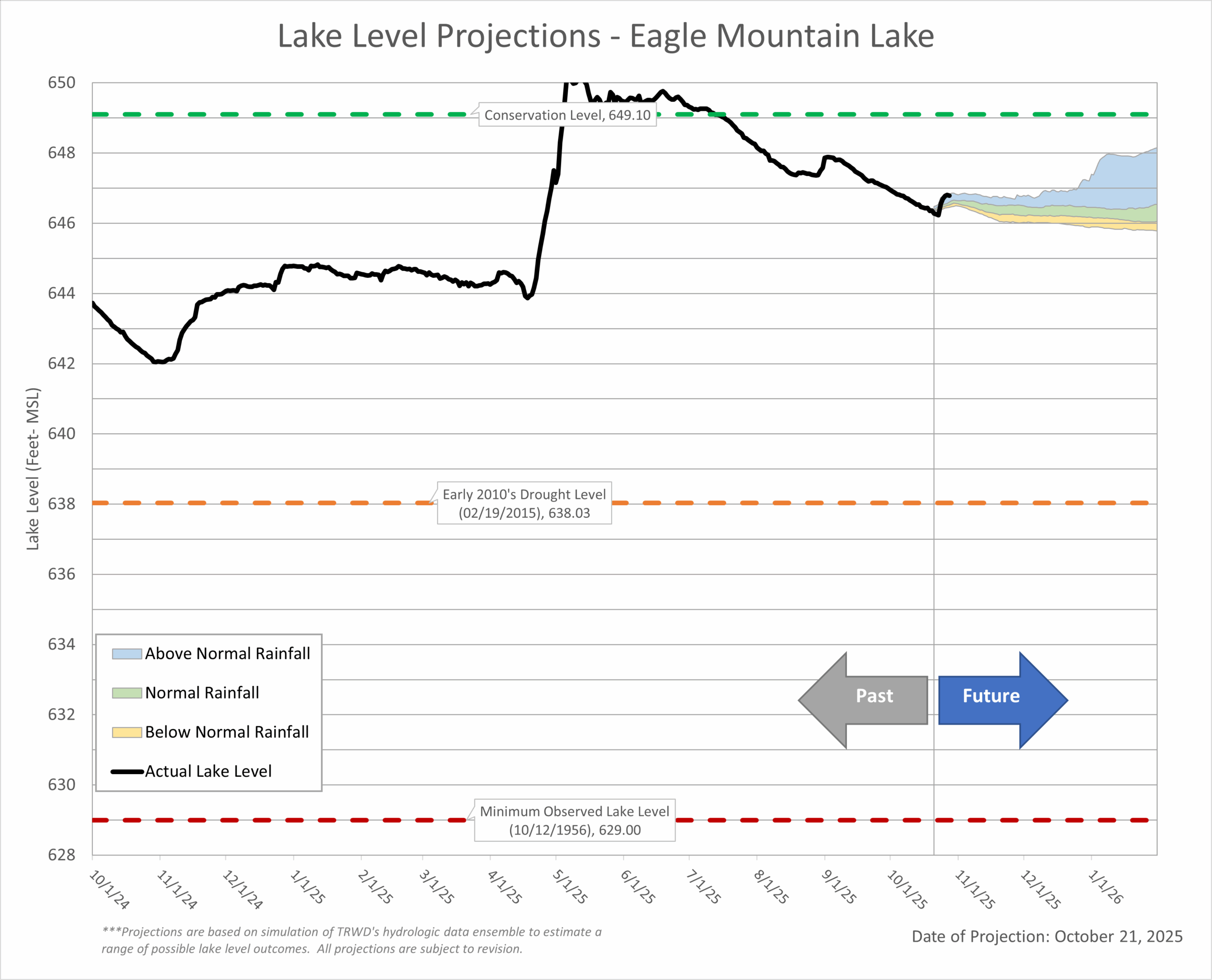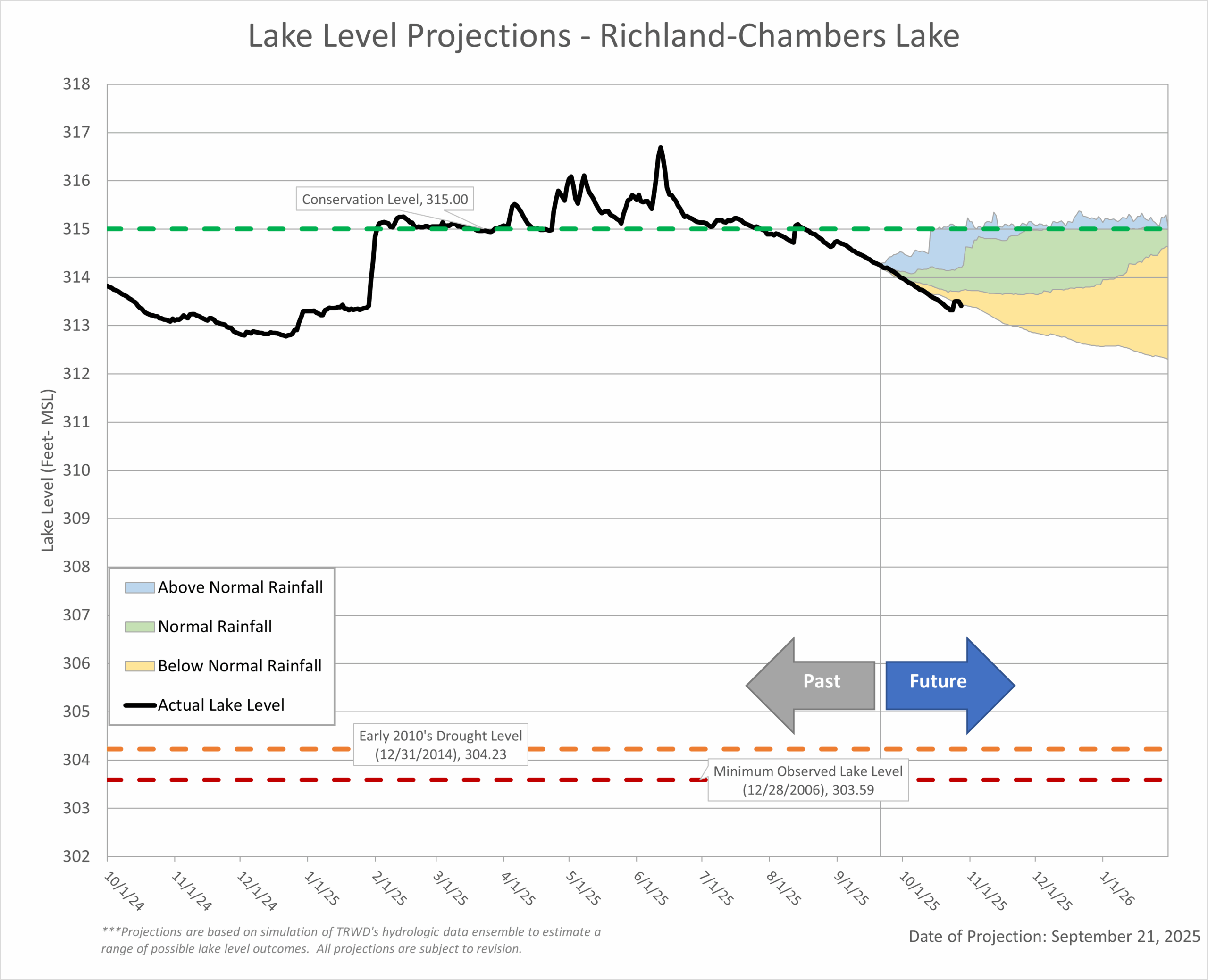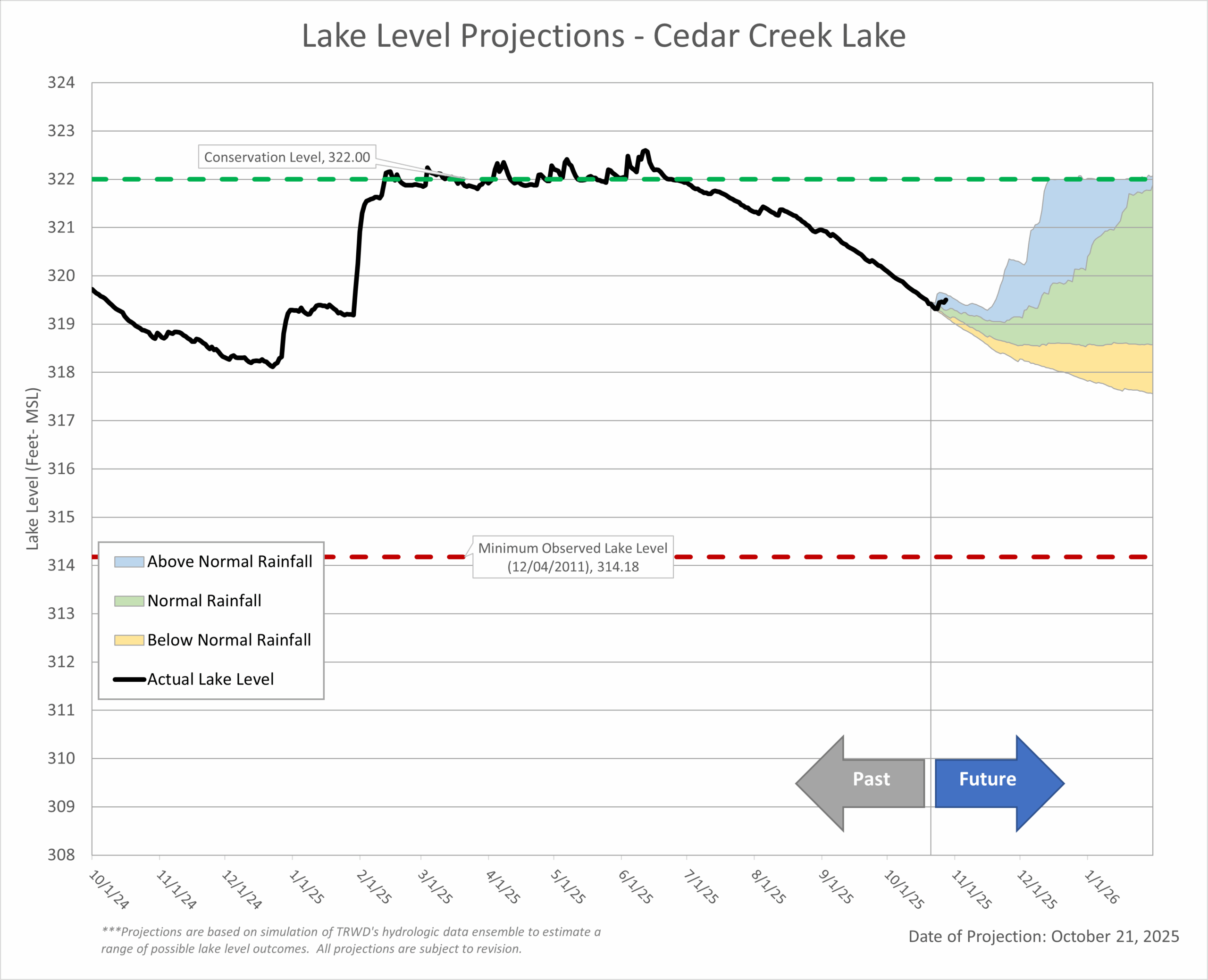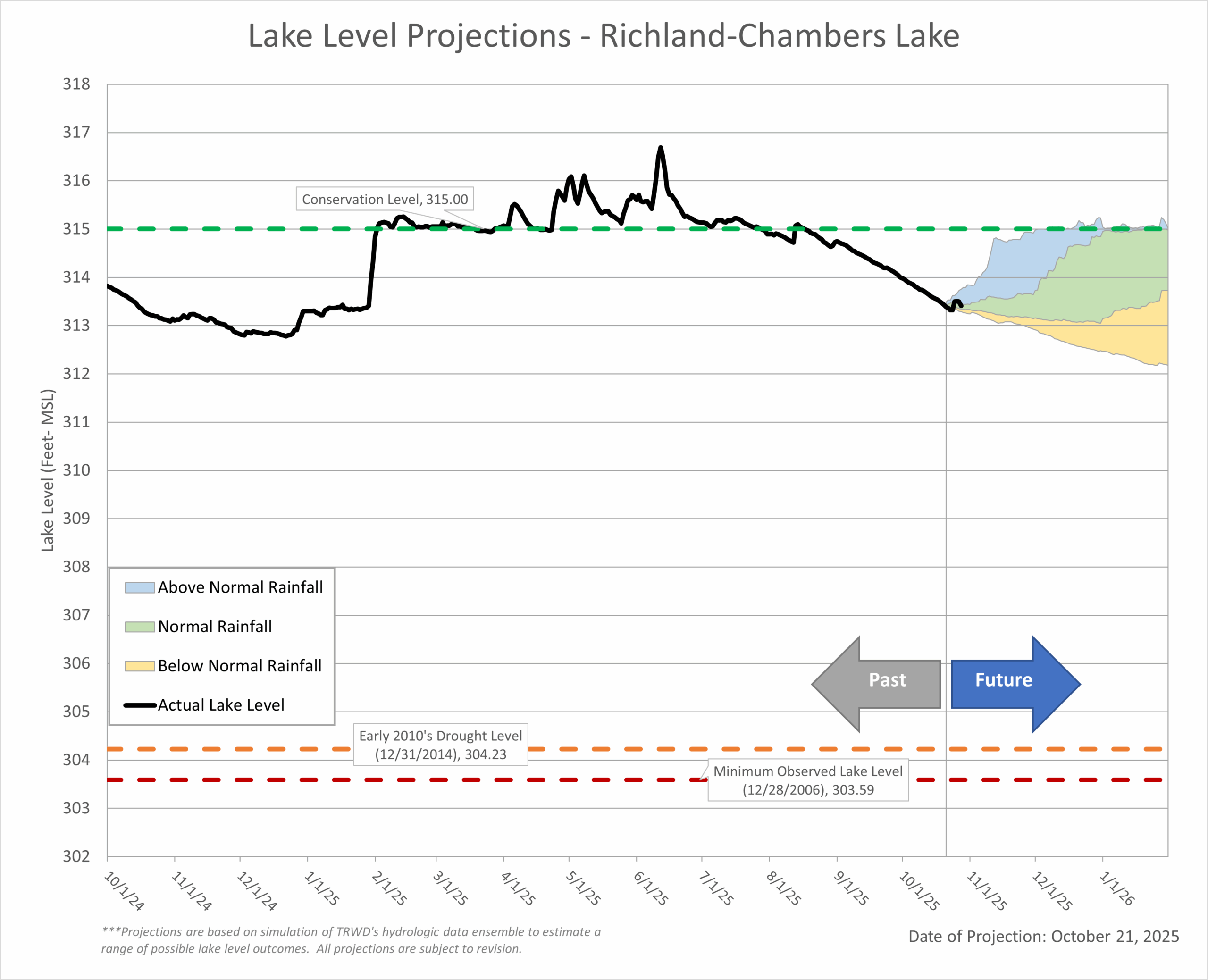 October was mostly warm and dry across the TRWD system, with only a few wet days late in the month. Although lake levels have gradually declined, total storage remains healthy at 90%, thanks to a wet spring and a mild August. The last time we saw 90% storage on November 1 was in 2021. Looking ahead, lake levels will likely decline this fall as dry conditions persist. The good news: the cooler months bring lower water demand and reduced evaporation, slowing the rate of decline. Plus, dormant vegetation means less soil absorption, so any rain we receive is more likely to turn into runoff.