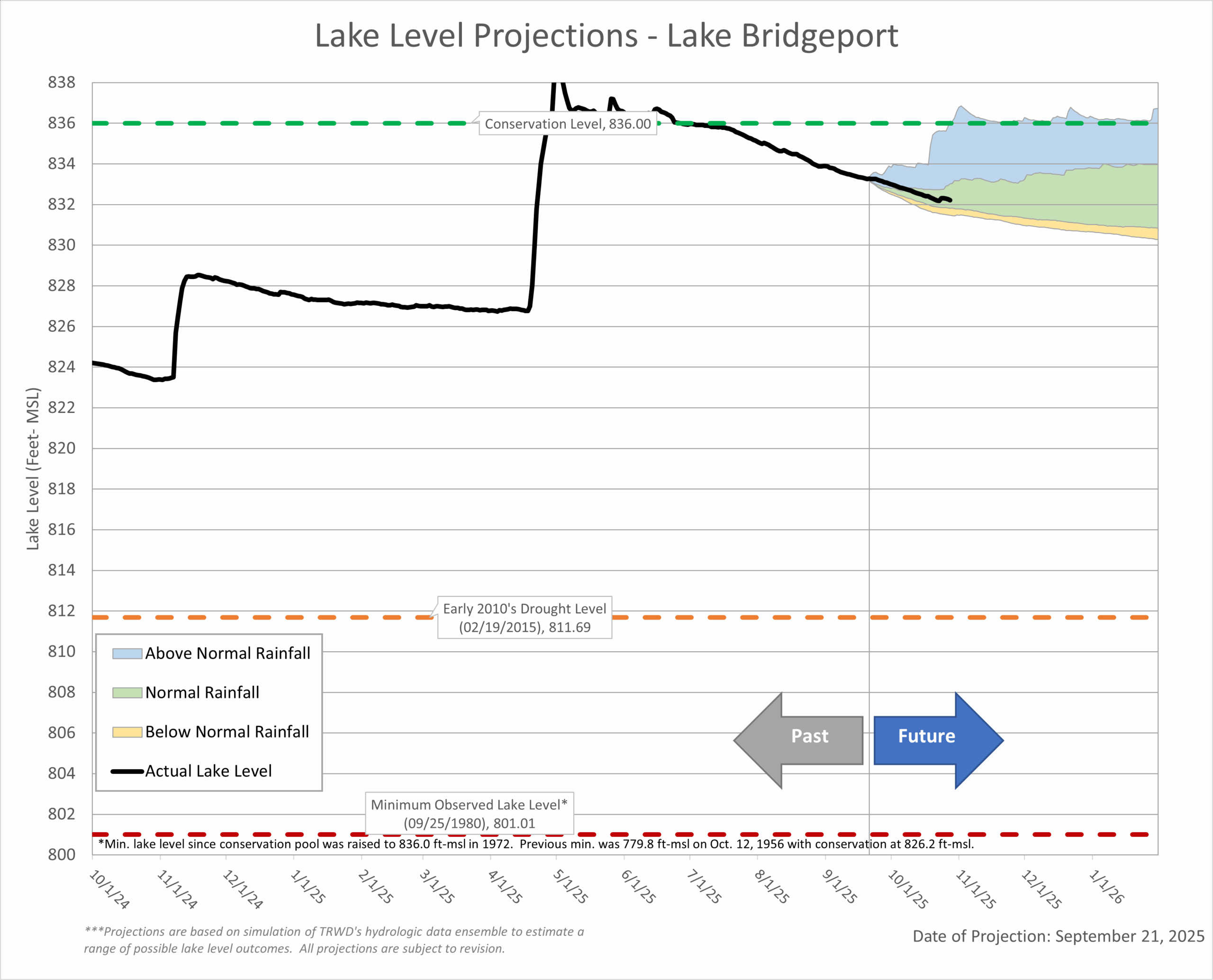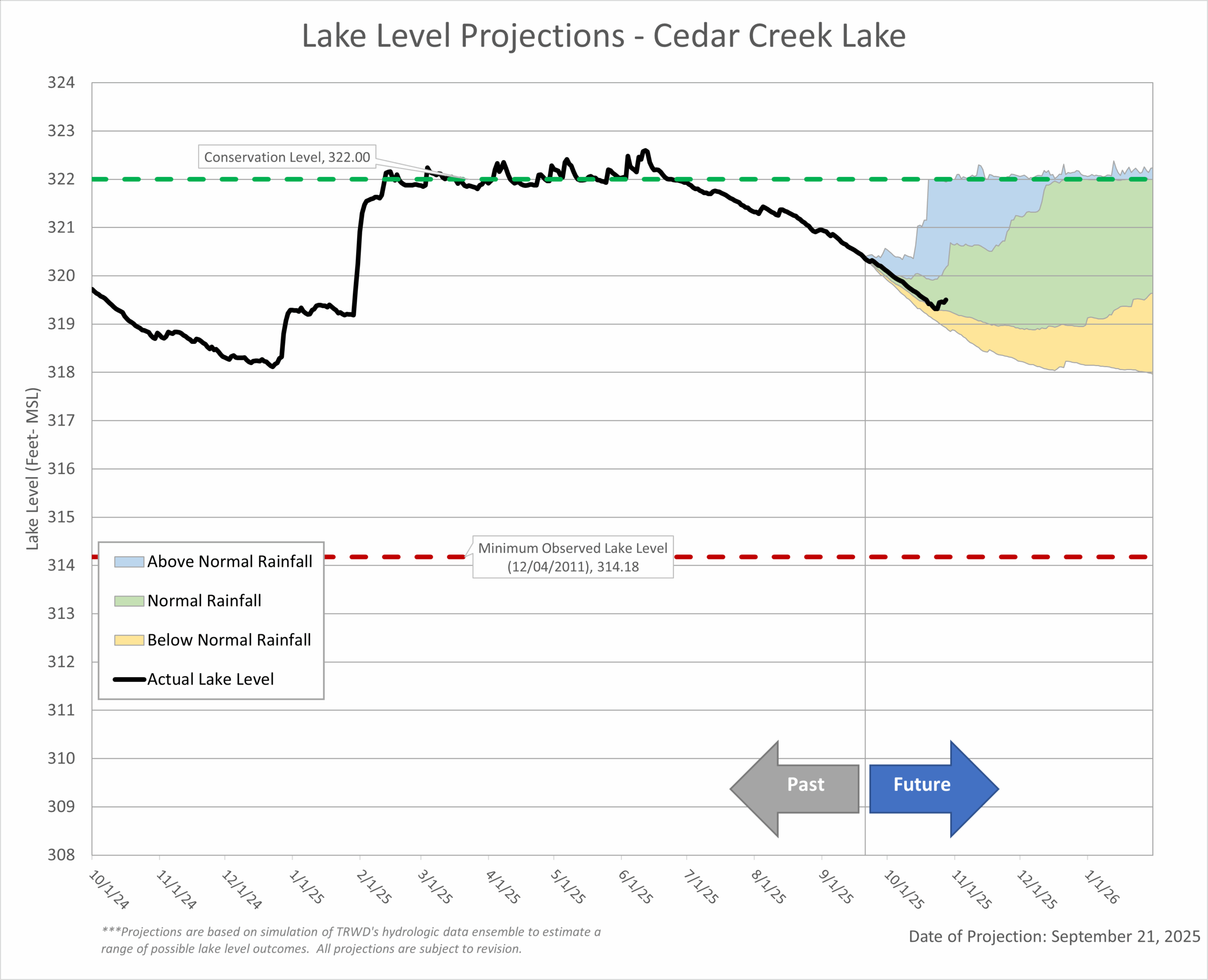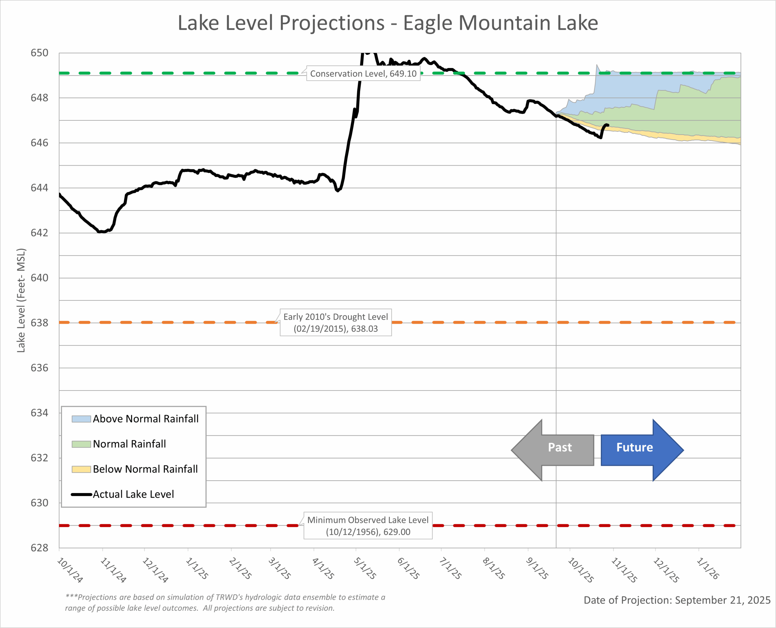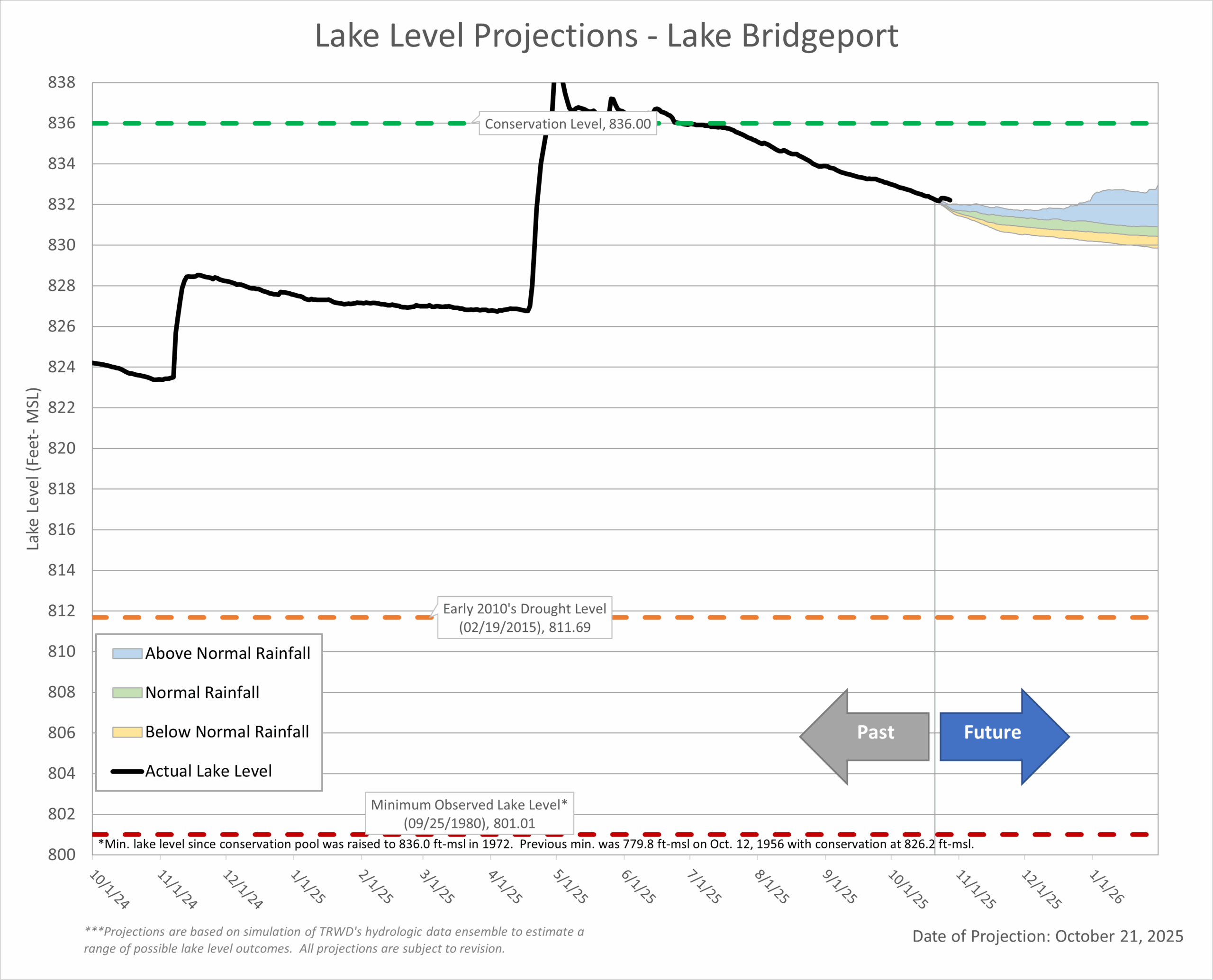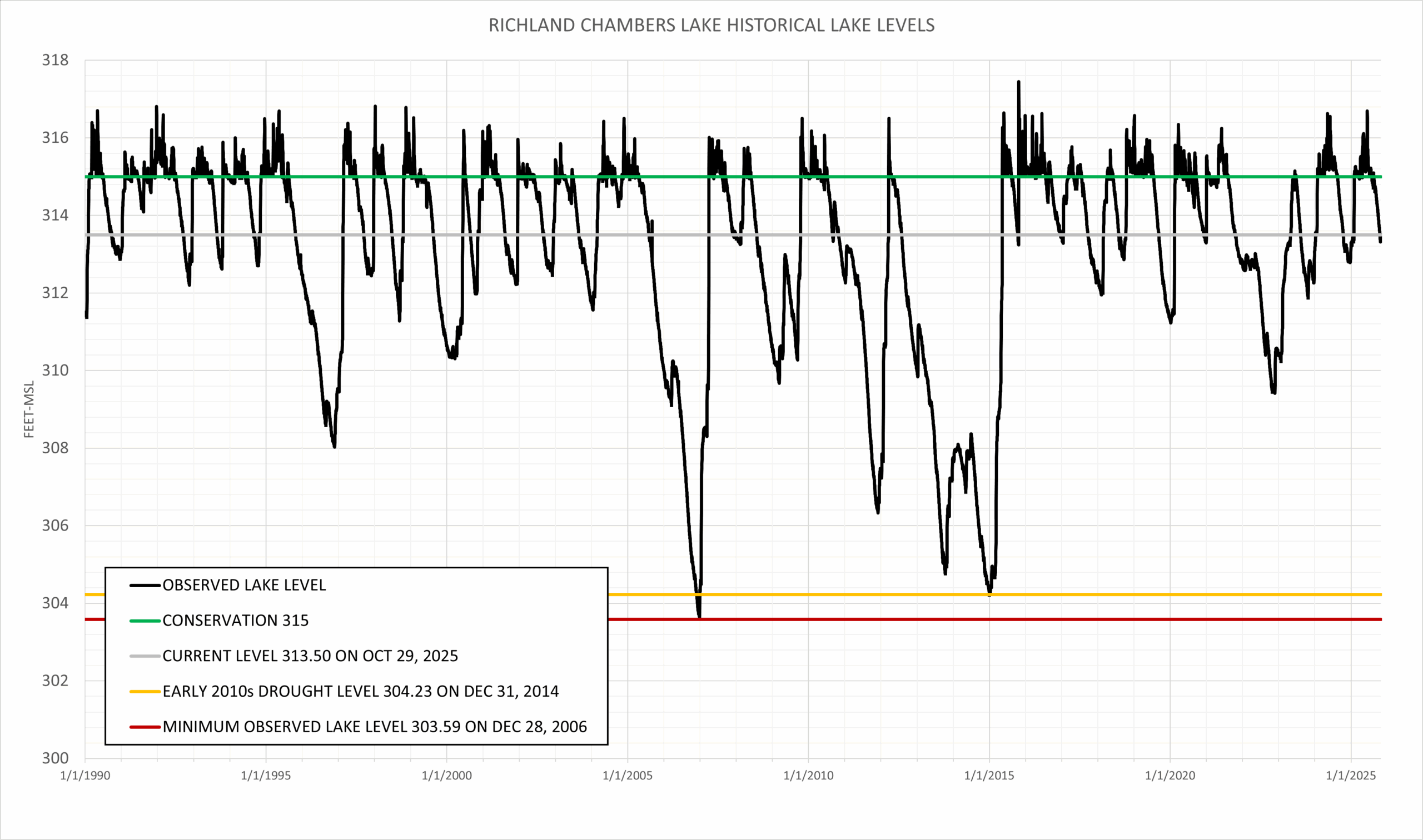 October was mostly warm and dry across the TRWD system, with only a few wet days late in the month. Although lake levels have gradually declined, total storage remains healthy at 90%, thanks to a wet spring and a mild August. The last time we saw 90% storage on November 1 was in 2021. Looking ahead, lake levels will likely decline this fall as dry conditions persist. The good news: the cooler months bring lower water demand and reduced evaporation, slowing the rate of decline. Plus, dormant vegetation means less soil absorption, so any rain we receive is more likely to turn into runoff.